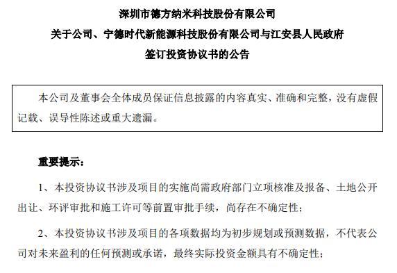 據投資協議書,在本協議生效后20日內,曲靖麟鐵在江安縣注冊具有獨立法人資格的全資子公司,該全資子公司的稅收解繳關系在江安縣,具體負責項目投資建設和生產經營的相關事宜。不過,在德方納米的公告中并未透露該事故是否會影響上述項目的推進。