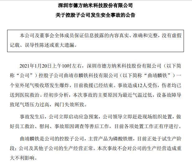 1月20日晚間,德方納米發布公告稱,1月20日上午10時左右,其控股子公司曲靖麟鐵一個室外尾氣吸收塔發生爆炸,目前救援已經結束。事故造成12人受傷,傷者均已送到醫院救治。經初步分析,本次事故的主要原因為最近氣溫過低,設備故障導致尾氣塔壓力過高,閥門失效所致。