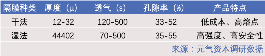 從技術工藝上,干法隔膜與濕法隔膜是現有兩種主流產品。干法隔膜技術起步較早,成本低、工藝相對簡單,干法成本約為1.3元/平米。而隨著高密度電池的需求不斷提升,有著更高安全性和更小熱收縮性的濕法隔膜市場占比開始提高,濕法隔膜的成本較高,約為1.95元/平米。兩者成本相差近60%。