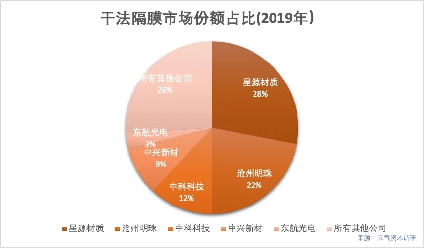 自2017年起,兩家公司分別從4%,9%的市占率開始不斷減產,于2019年雙雙告負出局。經過一番慘烈出清,“寡頭”格局出現,高工產業網資料整理顯示,2019年干法隔膜國內前五大生產廠商占據了74%的市場份額。