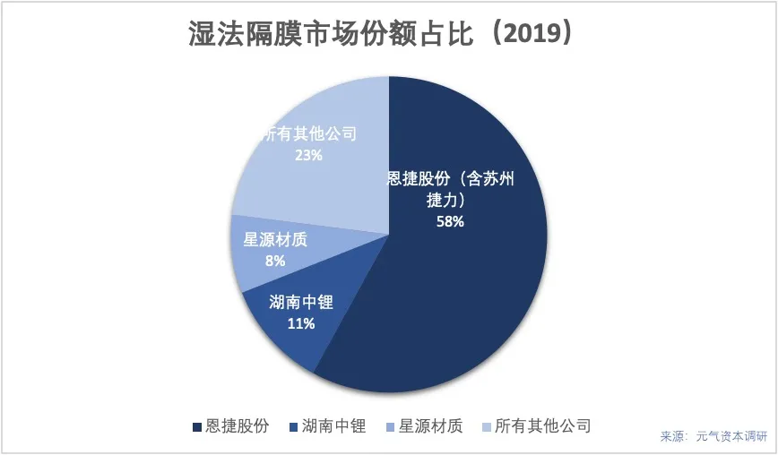 而濕法隔膜的頭部效應更甚,2019年恩捷股份收購蘇州捷力之后與湖南中鋰和星源材質兩家公司一同占據了市場77%的銷售總量,其中,僅龍頭恩捷股份國內市場占有率高達58%。