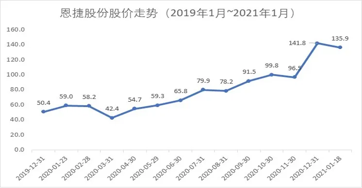 從二級市場的股價走勢不難看出,市場對于恩捷股份的產能擴張戰略認可度較高。行業龍頭地位穩固,市值超過1,200億元,僅2020年年內便已實現200%的漲幅。