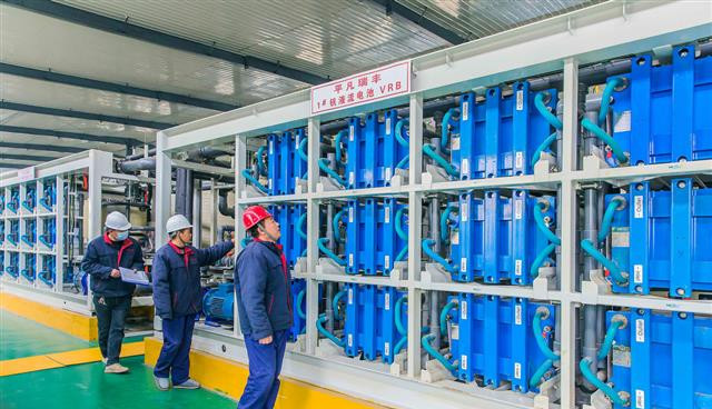1月21日,技術(shù)人員在全釩液流電池儲(chǔ)能車間對儲(chǔ)能電堆進(jìn)行常規(guī)定檢。(湖北日報(bào)全媒記者 梅濤 攝)