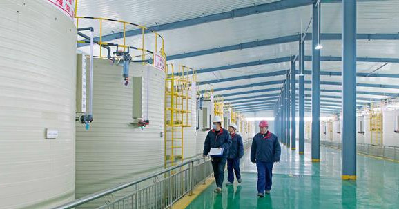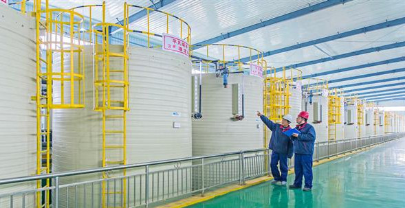 4000多平方米的車間里,兩邊排列著約5米高、40個(gè)圓形金屬罐。平凡瑞豐公司董事長謝光國介紹說,這是釩電解液儲(chǔ)罐,每個(gè)儲(chǔ)罐能容納約30立方米的釩電解液。儲(chǔ)罐旁安裝著3層藍(lán)色的釩液流電池組,一根根粗如嬰孩手臂的管線將電池組聯(lián)結(jié)起來。