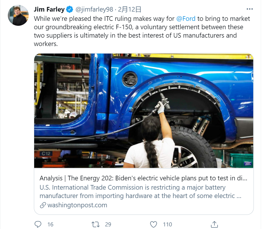 在ITC做出裁決后,福特首席執行官吉姆·法利(Jim Farley)也在推特上表示,兩家公司之間的和解,將符合美國制造商和工人的最大利益。