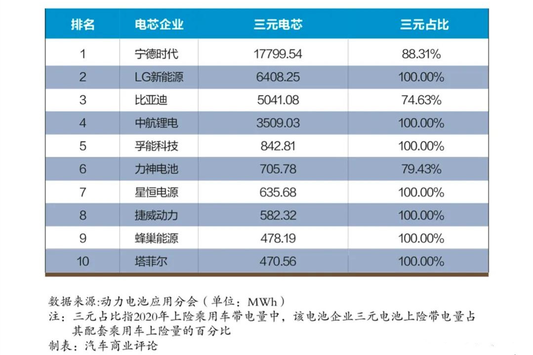 在三元鋰電領(lǐng)域,寧德時代以17799.54MWh的帶電量位居國內(nèi)第一。LG化學(xué)憑借配套國產(chǎn)特斯拉Model 3/Y,以6408.25MWh的帶電量位居中國市場裝機(jī)量排名第二,比亞迪則以5041.08MWh的帶電量位居第三。