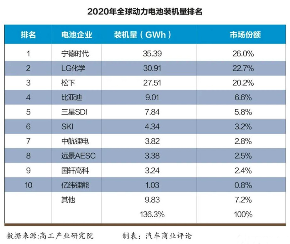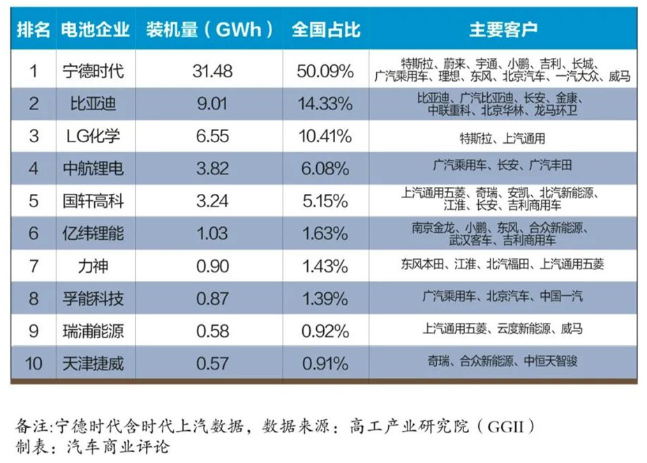 前三甲為寧德時代(31.48GWh),比亞迪(9.01GWh),LG化學(xué)(6.55GWh),所占份額分別為50.09%、14.33%、10.41%。