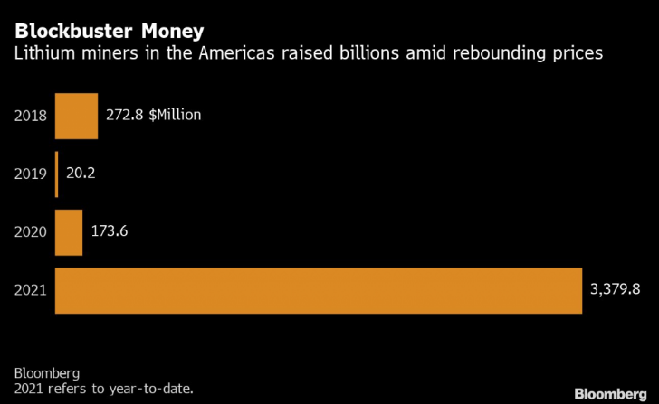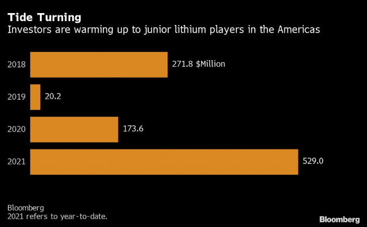彭博社數(shù)據(jù)顯示,初級鋰礦商今年籌資5.29億美元。這比2018年至2020年的融資總額多出約6300萬美元。