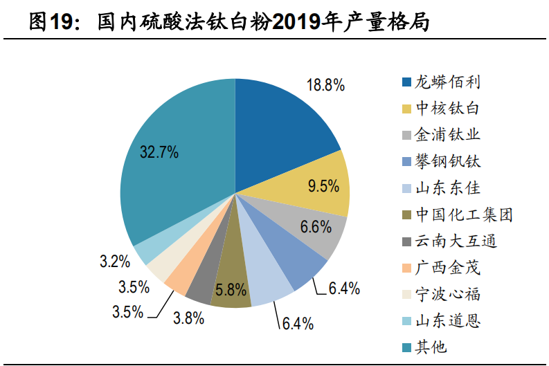 (1)鈦白粉龍頭規(guī)模優(yōu)勢(shì)明顯。根據(jù)鈦白粉產(chǎn)業(yè)技術(shù)創(chuàng)新戰(zhàn)略聯(lián)盟,2019年國(guó)內(nèi)鈦白粉綜合有效產(chǎn)能達(dá)到384.5萬噸,其中硫酸法346萬噸,氯化法38.5萬噸, 硫酸法前兩大龍頭企業(yè)分別為龍蟒佰利、中核鈦白,產(chǎn)能分別達(dá)到65萬噸和33萬噸, 占比18.8%和9.5%。氯化法工藝更為高端,龍蟒佰利以26萬噸產(chǎn)能、67.5%的市占率大幅領(lǐng)先。總體來看,龍蟒佰利作為鈦白粉龍頭領(lǐng)先優(yōu)勢(shì)較大,第二梯隊(duì)包括中核鈦白、金浦鈦業(yè)等五家市占率較為接近的企業(yè)。2019年全行業(yè)產(chǎn)能利用率83.68%, 其中大中型企業(yè)產(chǎn)能利用率普遍較高。