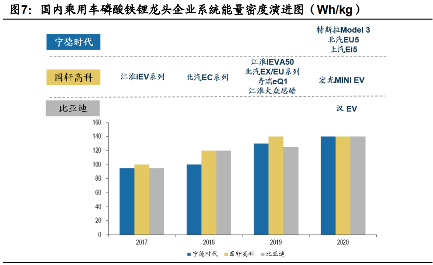 國(guó)內(nèi)磷酸鐵鋰產(chǎn)品不斷突破瓶頸。2020年寧德時(shí)代、國(guó)軒高科和比亞迪的磷酸鐵鋰電池系統(tǒng)能量密度均達(dá)到140Wh/kg,打開乘用車市場(chǎng)應(yīng)用范圍。國(guó)軒高科以磷酸鐵鋰技術(shù)見長(zhǎng),未來結(jié)合軟包、硅碳負(fù)極、JTM等工藝和技術(shù),實(shí)驗(yàn)室系統(tǒng)能量密度有望達(dá)到200Wh/kg,而比亞迪的磷酸鐵鋰系統(tǒng)能量密度在刀片電池技術(shù)帶動(dòng)下也將不斷上探。