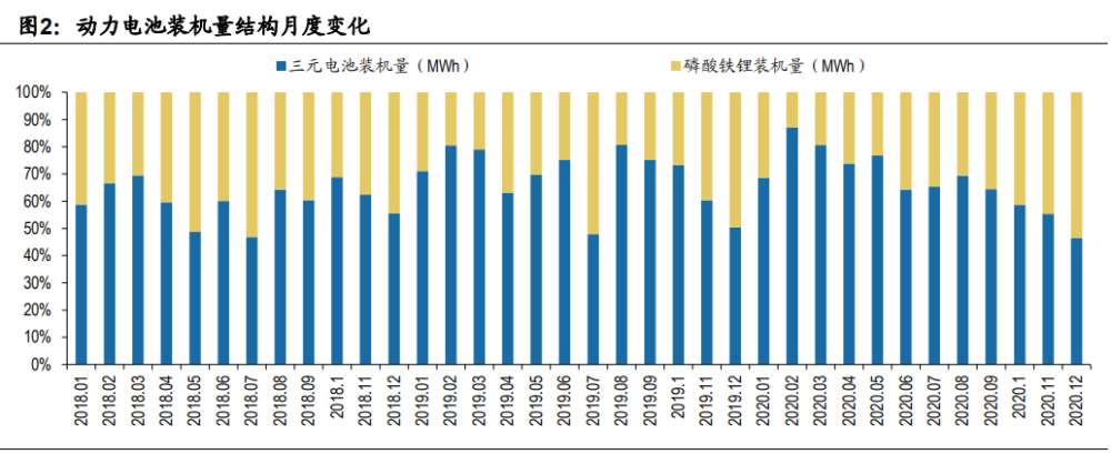 磷酸鐵鋰助力打造高性價(jià)比爆款車型。2020年底以來磷酸鐵鋰電池憑借高安全性和低成本等優(yōu)勢(shì),結(jié)合寧德時(shí)代CTP、比亞迪刀片、國(guó)軒高科JTM等結(jié)構(gòu)創(chuàng)新不斷突破技術(shù)上限,降本增效打造從A00級(jí)五菱Mini到B級(jí)特斯拉Model 3等爆款車型。 2020年9月到2021年2月,宏光mini EV和特斯拉Model 3始終占據(jù)銷量前二,此外比亞迪漢EV也基本保持月銷前五。磷酸鐵鋰電池后續(xù)配套小鵬G3/P7、長(zhǎng)城歐拉R1、 上汽榮威Ei5等車型,有望進(jìn)一步提高國(guó)內(nèi)裝機(jī)占比,同時(shí)2020年特斯拉、2023年大眾有望先后啟動(dòng)海外磷酸鐵鋰車型周期,海外客戶接受度逐漸提升。