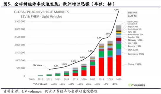 外部環境來看,全球主要經濟體對新能源車產業不斷施以強有力的政策刺激;產業鏈來看,傳統車廠強勢布局,造車新勢力日漸成熟,新能源車技術不斷完善。多重因素推動下,全球新能源乘用車銷量快速增長,其中,中國為最大市場,歐洲地區憑借強有力的政策刺激,近兩年增長迅猛。