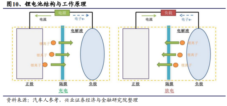 鋰電池的電芯材料(簡稱“電池材料”,下同)包括主材正極材料、負極材料、電解液、隔膜四大材料以及導電劑、粘結劑等其他輔材。鋰電池的充放電過程即鋰離子在正負極間不斷嵌入和脫嵌的過程。在電池放電時,負極材料中的鋰原子會脫插成為鋰離子,通過電解液,嵌入正極;而在充電時,正極材料上的鋰離子會發生脫嵌,經過電解液,在負極被還原成鋰原子嵌入到負極材料中。而在整個充放電過程中,電池材料對于電池的容量、充電速度、安全性等均有直接且重大的影響,是決定鋰電池性能的關鍵。