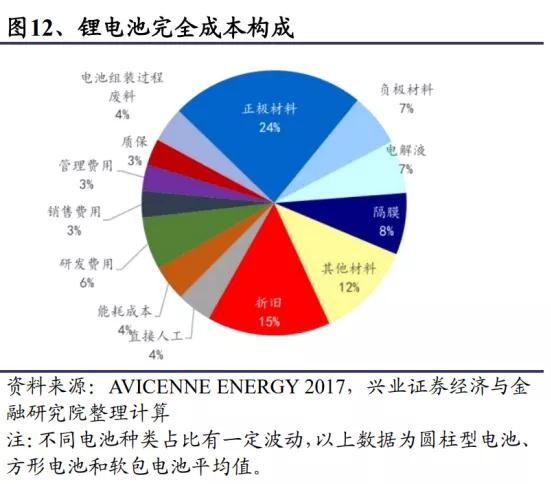 根據AVICENNE ENERG,電池材料合計成本約占鋰電池完全成本的55%-65%,其中四大材料占完全成本約46%。四大材料中,正極材料成本占比最高,占比完全成本約24%;負極、電解液與隔膜的成本均占比完全成本的7%-8%。