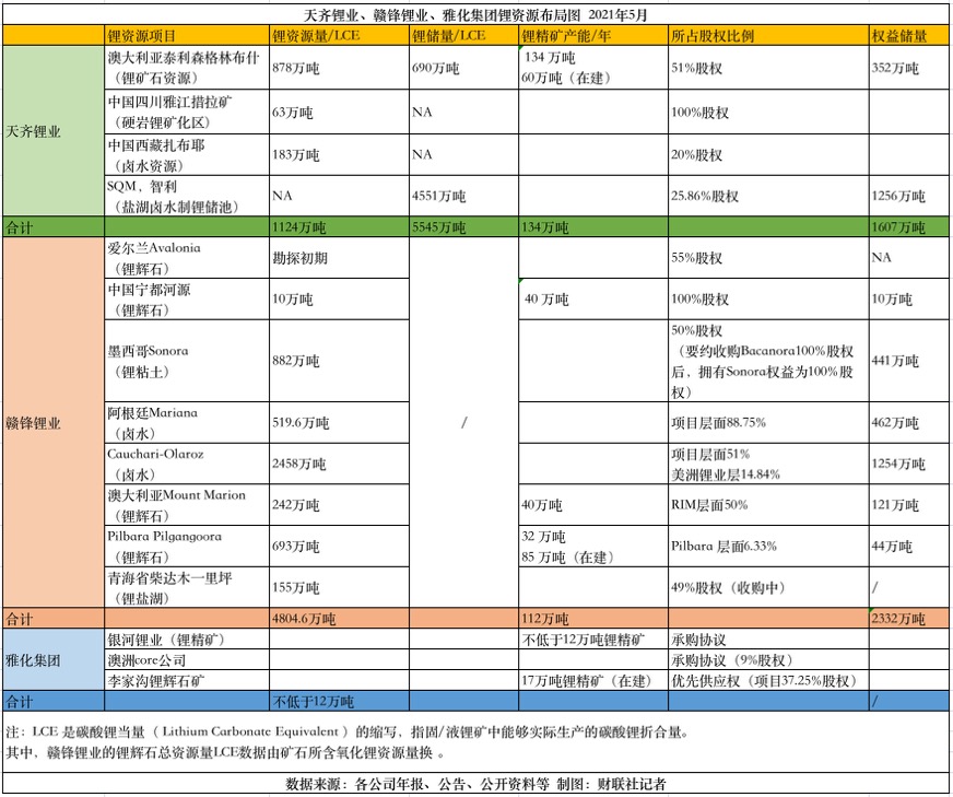 從目前鋰資源端的戰(zhàn)略布局來看,已明確的權(quán)益儲量中,贛鋒鋰業(yè)以2332萬噸(由于公司未披露鋰儲量數(shù)據(jù),暫以鋰資源量換算)當(dāng)之無愧成為龍頭,而天齊鋰業(yè)以1607萬噸緊跟其后,上述兩公司通過海內(nèi)外布局,坐擁全球最為優(yōu)質(zhì)的鋰資源,雅化集團(tuán)則主要依賴銀河礦業(yè)進(jìn)口鋰精礦。