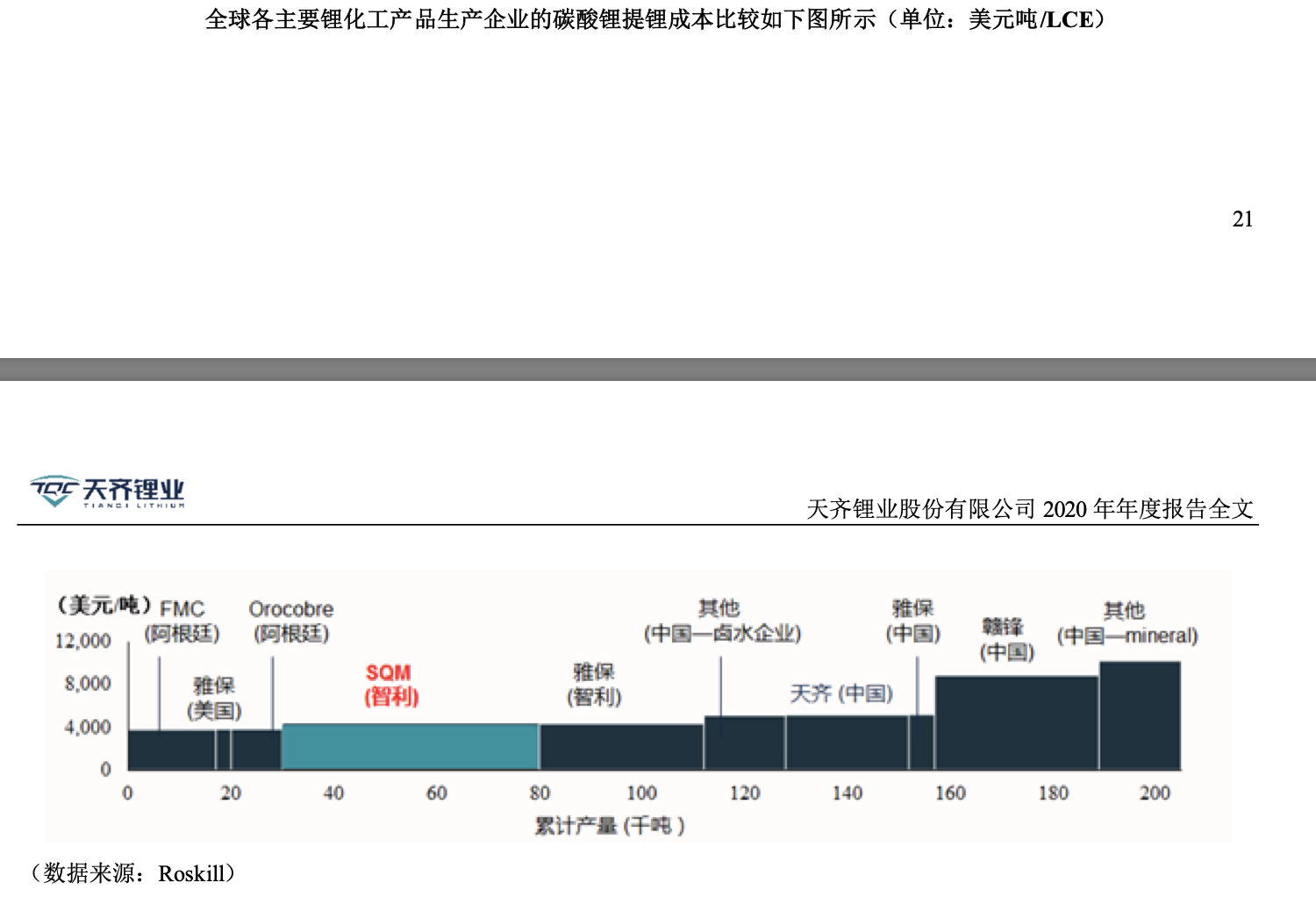 綜上,通過對上述公司權(quán)益資源量、海內(nèi)外布局豐富度、鋰原材料多樣性等綜合考量,在鋰資源布局優(yōu)勢上,顯然排名為:贛鋒鋰業(yè)(2332萬噸)>天齊鋰業(yè)(1607萬噸)>雅化集團(tuán)(承銷協(xié)議)。但鋰資源品位、提鋰成本等優(yōu)勢上,天齊鋰業(yè)>贛鋒鋰業(yè)>雅化集團(tuán),據(jù)Roskill數(shù)據(jù)顯示,在全球各主要鋰化工產(chǎn)品生產(chǎn)企業(yè)的碳酸鋰提鋰成本中,天齊鋰業(yè)成本為國內(nèi)最低。