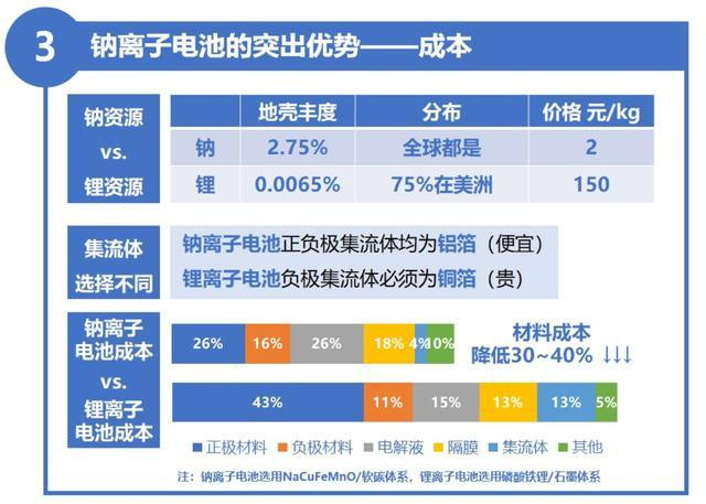 貝殼財(cái)經(jīng)記者獲悉,鈉離子電池與目前主流的鋰離子電池工作原理相同,制造工藝相似,優(yōu)勢在于成本較低,原材料資源豐富,且安全性能較高,缺陷之一在于其能量密度、循環(huán)壽命等性能指標(biāo)低于鋰離子電池,因而無法匹配車用電池續(xù)航里程的要求。