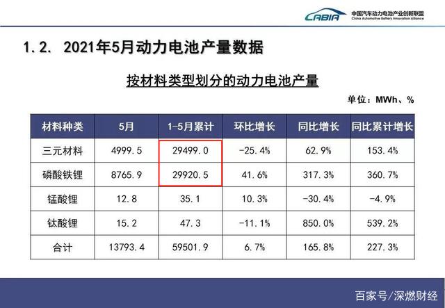 但是到了2020年,三元電池的產(chǎn)量和裝車量占比分別降至58%、61%。2021年前5個月,三元電池的產(chǎn)量占比降至49.6%,而磷酸鐵鋰電池產(chǎn)量占比升至50.3%,首次超過三元電池。