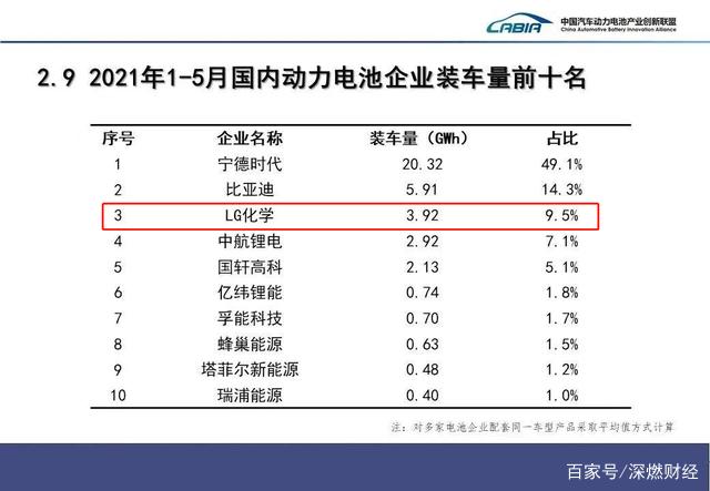 中國汽車動力電池產(chǎn)業(yè)創(chuàng)新聯(lián)盟發(fā)布的數(shù)據(jù)顯示,2020年之前,我國動力電池企業(yè)裝車量排名前十中,沒有一家外資電池企業(yè)。但是在2020年1月,也就是特斯拉Model 3國產(chǎn)化后,松下和LG化學(xué)首次擠進前十名單。2020年全年,LG化學(xué)排第三,僅次于寧德時代和比亞迪,松下排第六。2021年前5個月,LG化學(xué)牢牢占據(jù)第三的位置,市占率提升至9.5%,而寧德時代市占率跌落50%以下。