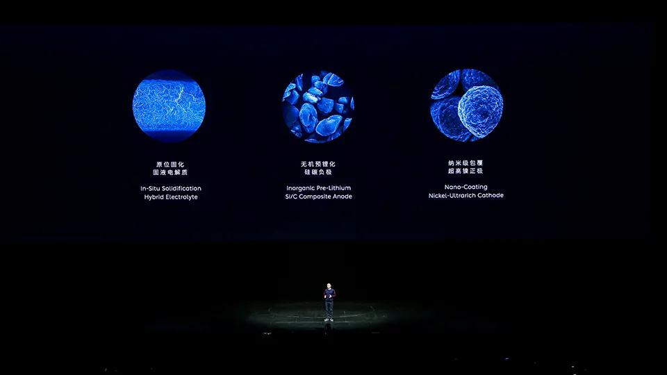 電池技術(shù)。在場(chǎng)的人大多沒有發(fā)現(xiàn)一個(gè)細(xì)節(jié),盡管大屏幕上投屏的是Solid State Battery,但從李斌嘴里說出來的是“固態(tài)技術(shù)