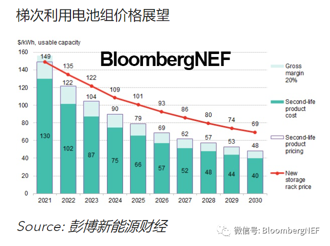 未來梯次利用產(chǎn)品的成本競爭力有望逐步提升,到2030年可能達到比新電池組便宜30%的水平。彭博新能源財經(jīng)作此判斷主要是基于退役動力電池的剩余價值,近年來新電池價格的降低將成為退役電池采購價格下降的關(guān)鍵。未來,動力電池退役規(guī)模的增加、電池拆解重組技術(shù)的改進等因素還將進一步助推梯次利用產(chǎn)品價格的下降。