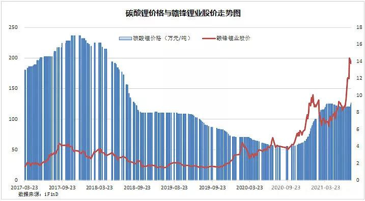 如上圖,碳酸鋰的價(jià)格從去年年中的4萬(wàn)出頭每噸的價(jià)格,到了現(xiàn)在9萬(wàn),翻了一倍,但離2017年鋰價(jià)高峰期時(shí)14萬(wàn)元每噸的價(jià)格還有相當(dāng)?shù)木嚯x。與之相對(duì)應(yīng)的是,龍頭贛鋒鋰業(yè)的股價(jià),卻早就超越2017年的高點(diǎn),不斷勇創(chuàng)新高了。