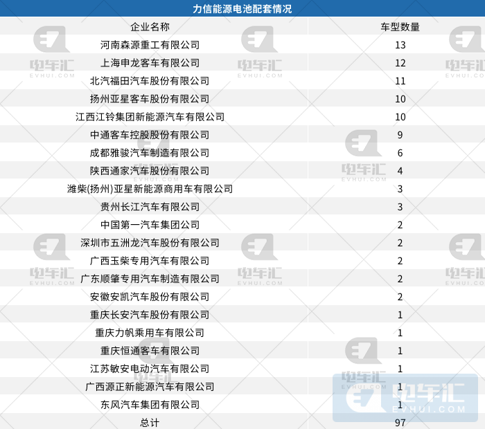 據(jù)電車匯統(tǒng)計(jì),成立于2016年的力信能源從2017年開始就在對(duì)外配套電池。截止目前,力信能源為森源重工、申龍客車、北汽福田、亞星客車、江鈴新能源、中通客車等21家主流整車企業(yè)配套了電池,共計(jì)配套了97款新能源車型。不過(guò)從去年10月份開始,力信能源就沒(méi)有出現(xiàn)在新能源汽車推薦目錄的電池配套企業(yè)中。