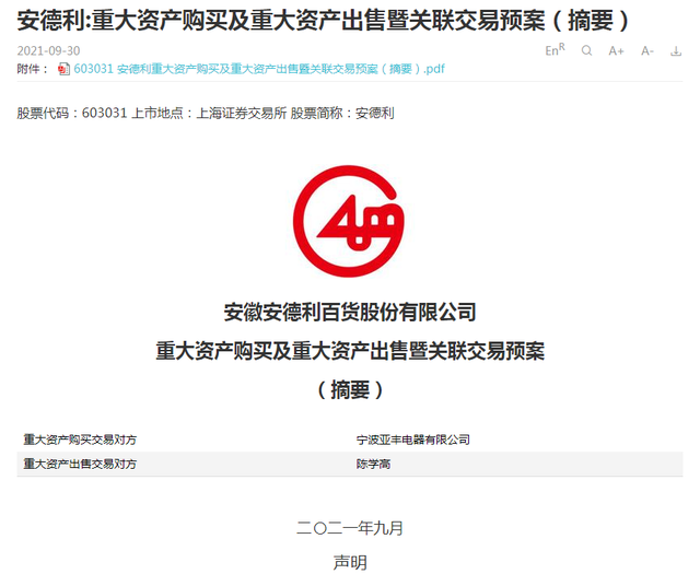 經歷問詢后,在國慶節前的最后一個交易日,安德利的收購交易預案已正式出爐。