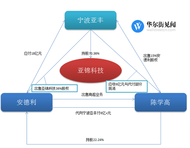 陳學高將目前持有的安德利的股權中15%轉讓給亞錦科技目前的股東寧波亞豐,作價計6.56億元,可以用現金支付或用債務抵消。