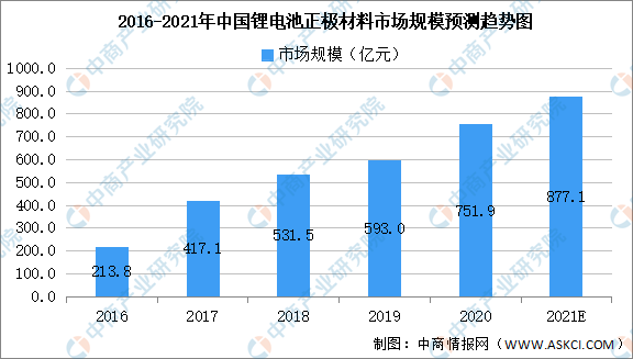 數(shù)據(jù)顯示,我國鋰電池正極材料市場規(guī)模由2016年213.8億元增至2020年751.9億元,年均復(fù)合增長率為36.9%。中商產(chǎn)業(yè)研究院預(yù)測,2021年我國正極材料市場規(guī)模可達877.1億元。