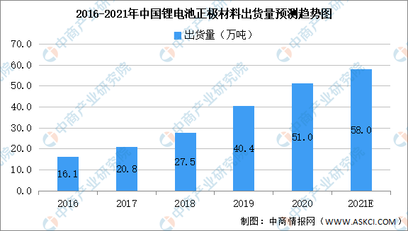 數(shù)據(jù)顯示,我國鋰電池正極材料出貨量由2016年16.1萬噸增至2020年51.0萬噸,年均復(fù)合增長率為33.4%。中商產(chǎn)業(yè)研究院預(yù)測,2021年我國正極材料出貨量可達58.0萬噸。