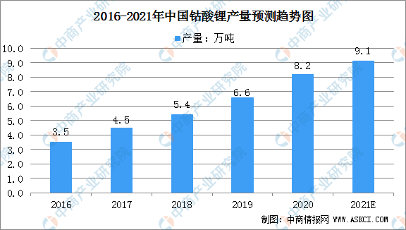 鈷酸鋰正極材料有鈷價格昂貴、循環(huán)性能差、安全性能差等劣勢。由于新能源汽車下游消費者對于購車成本的敏感性,鈷酸鋰電池已經(jīng)很少出現(xiàn)在新能源汽車配套名錄中。此外,其傳統(tǒng)的3C下游市場也部分被三元正極材料替代。但由于其振實密度大、工作電壓高等特點,目前在超薄電子產(chǎn)品領(lǐng)域仍有優(yōu)勢。數(shù)據(jù)顯示,2020年我國鈷酸鋰產(chǎn)量達8.2萬噸,相比2016年產(chǎn)量增加了4.7萬噸,預(yù)計2021年我國鈷酸鋰產(chǎn)量可達9.1萬噸。