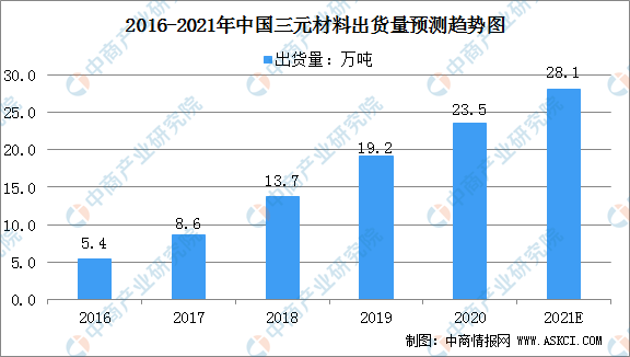 數(shù)據(jù)顯示,2020年我國三元材料出貨量達23.5萬噸,預(yù)計2021年我國三元材料出貨量分別可達28.1萬噸。