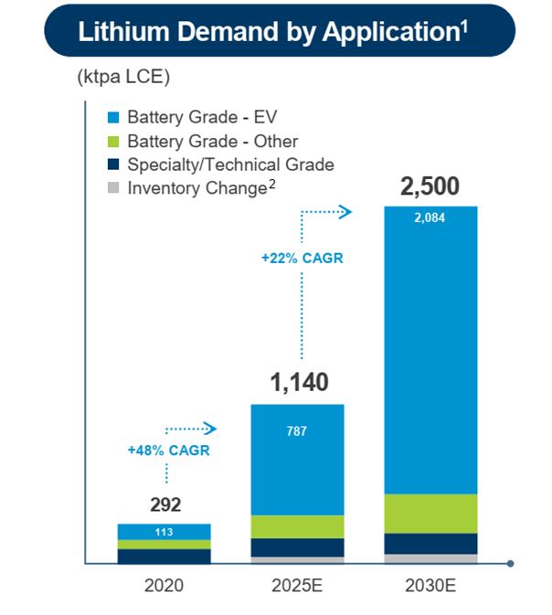 而從長遠的需求出發,雅保公司預測至2030年,全球對鋰的需求將達到2500千噸碳酸鋰當量/年。2020年至2025年的復合增長率為48%,2026年至2030年的復合增長率為22%。