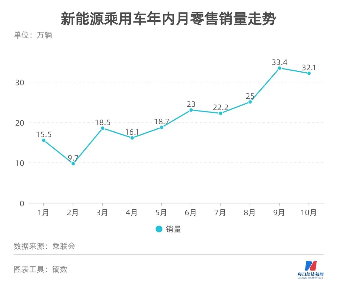 值得一提的是,這樣的成績還是在汽車行業(yè)整體銷量同比下滑的背景下取得的。從整個乘用車市場來看,10月份的零售量為171.7萬輛,同比下降了13.9%。一邊是汽車市場的整體下滑,一邊是新能源汽車的高歌猛進,“冷和熱”的對比之中,足以凸顯新能源汽車發(fā)展之迅猛。