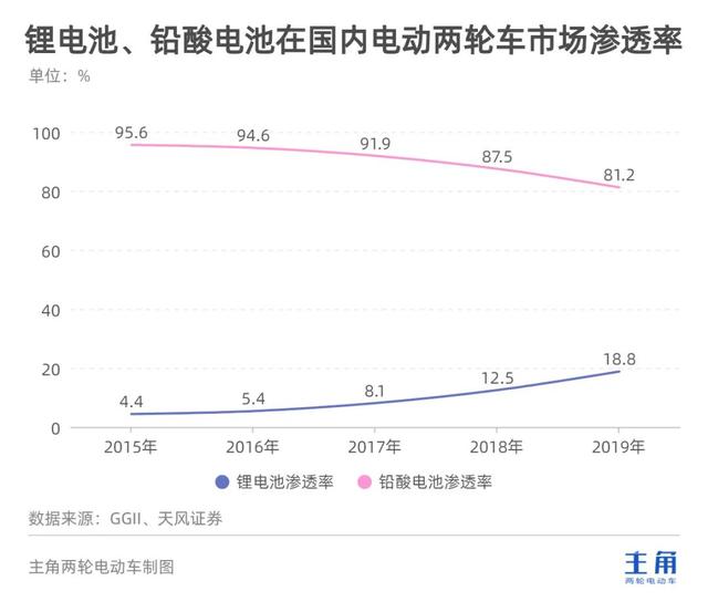 新國標要求整車質(zhì)量不高于55kg,而續(xù)航相同的情況下,鉛酸電池重量約為17kg,僅為4.7kg鋰電池顯然更符合新國標要求。隨著輕量化、鋰電化的聲浪越來越高,在行業(yè)政策+市場增量的雙重刺激下,催生出一個規(guī)模巨大的鋰電池市場。