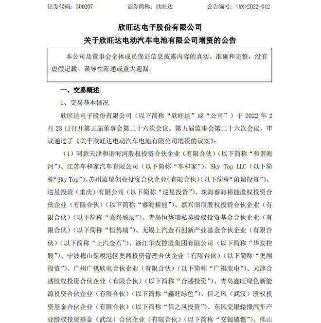 2月24日,欣旺達發布公告稱,公司在23日召開的董事會中審議通過了《關于欣旺達電動汽車電池有限公司增資的議案》,引入了19名投資者。本次增資對應的欣旺達電池公司合計股權比例為19.5495%,增資完成后欣旺達電池公司的注冊資本將由約50.887億人民幣增至 63.252億人民幣。