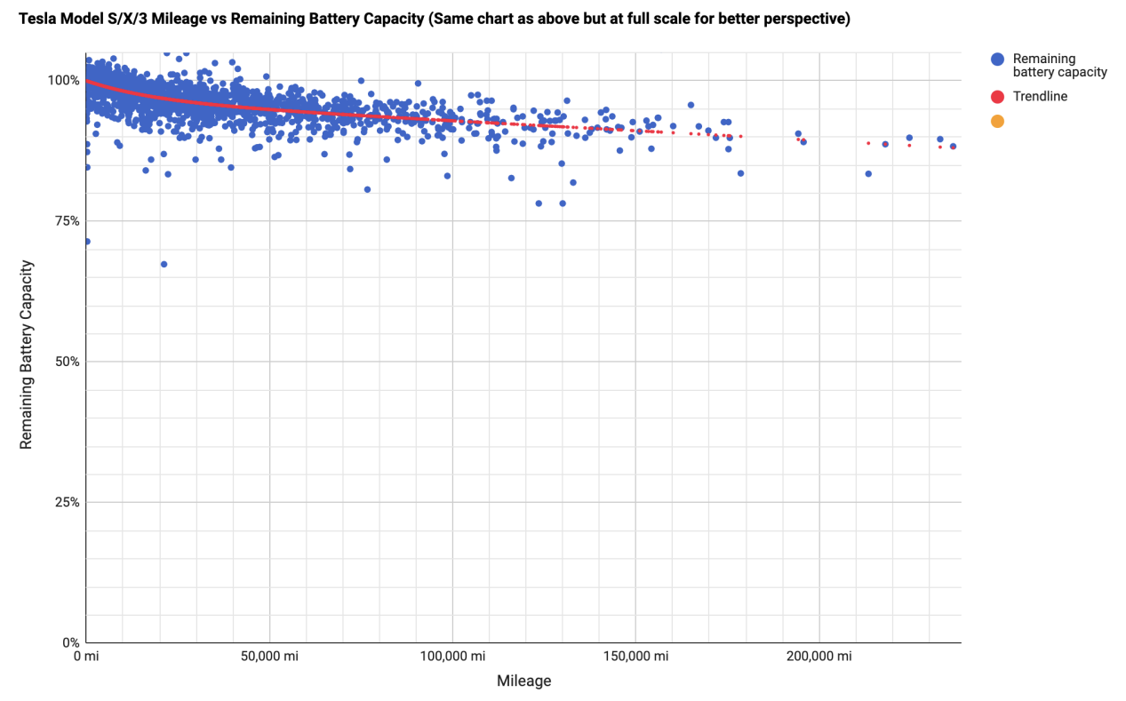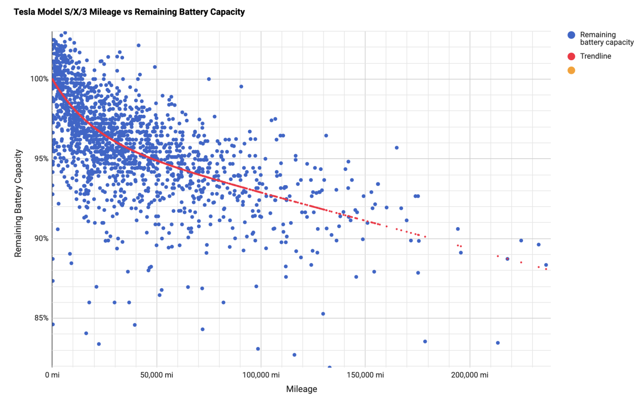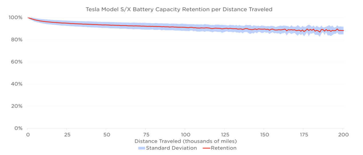 先前,熱心網友還統計了特斯拉車輛的電池衰減情況,從圖表中可以看出,經過5萬英里的行駛,大部分特斯拉車輛(統計車型為特斯拉Model S/X/3)電池僅衰減了5%,10萬公里后,則僅不到10%,即使在20萬英里后,也大多不到15%。