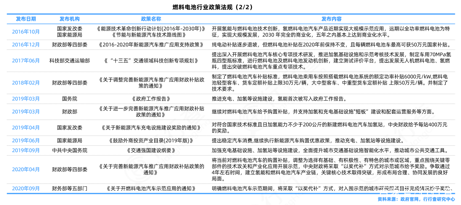 自2006年以來,我國(guó)在多項(xiàng)能源發(fā)展相關(guān)政策中提到氫能與燃料電池技術(shù)的推進(jìn),同時(shí),目前我國(guó)已國(guó)民經(jīng)濟(jì)和社會(huì)發(fā)展計(jì)劃的主要任務(wù)中提出要制定國(guó)家氫能產(chǎn)業(yè)發(fā)展戰(zhàn)略規(guī)劃,隨著國(guó)家及地方產(chǎn)業(yè)政策的逐步實(shí)施、我國(guó)氫燃料電池核心技術(shù)的逐步突破積累、相關(guān)配套產(chǎn)業(yè)的逐步完善,氫燃料電池行業(yè)未來將有廣闊的發(fā)展空間。