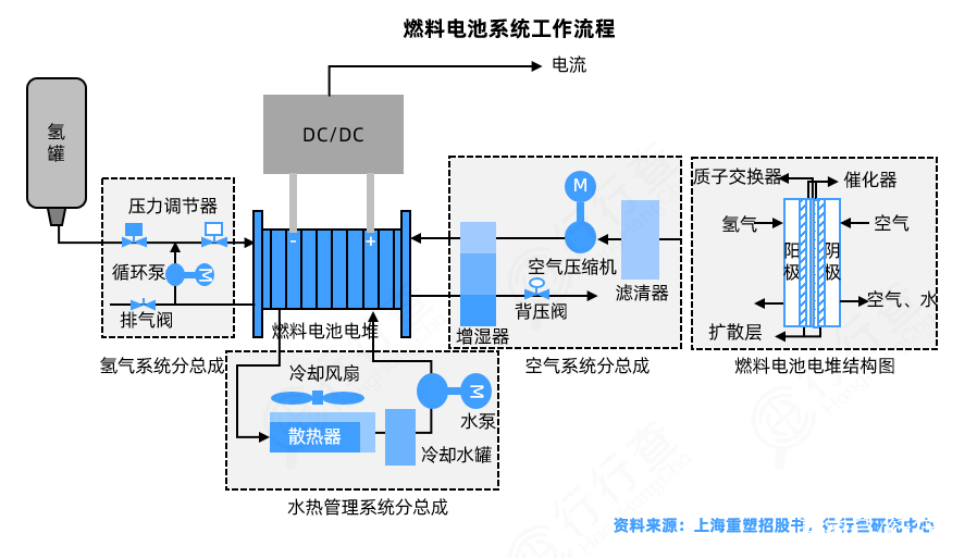 燃料電池系統(tǒng)使用供氫系統(tǒng)提供的氫氣進(jìn)行電化學(xué)反應(yīng),經(jīng)過DC/DC轉(zhuǎn)換輸出,以輸出滿足下游應(yīng)用場(chǎng)景中不同電機(jī)工作電壓要求的電流。燃料電池的電化學(xué)反應(yīng),消耗氫氣與氧氣,將氫氣中蘊(yùn)含的化學(xué)能轉(zhuǎn)化為電能,反應(yīng)過程不涉及燃燒,反應(yīng)產(chǎn)物為電、熱和水。燃料電池系統(tǒng)主要由燃料電池電堆、空氣/氫氣供給系統(tǒng)、水熱管理系統(tǒng)、DC/DC這五大系統(tǒng)構(gòu)成。燃料電池電堆可以通過電化學(xué)反應(yīng)輸出電流;空氣/氫氣供給系統(tǒng)是為電堆供應(yīng)合適壓力、純度、濕度的氫氣與空氣;水熱管理系統(tǒng)用于傳遞電化學(xué)反應(yīng)產(chǎn)生的熱量,保持燃料電池內(nèi)部水平衡和熱平衡;DC/DC變換器用于實(shí)現(xiàn)燃料電池與整車高壓之間解耦。