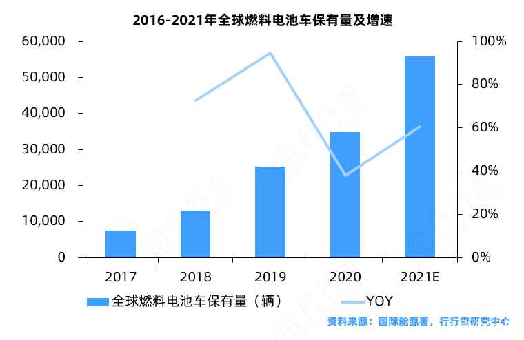 從全球燃料電池出貨量來看,全球燃料電池市場(chǎng)呈快速發(fā)展趨勢(shì)。2020年盡管受新冠肺炎疫情的影響增速有所放緩,但在亞太地區(qū)的拉動(dòng)下全球燃料電池出貨量仍然保持增長(zhǎng)態(tài)勢(shì),達(dá)到1,300MW左右,同比增長(zhǎng)約為10%,2016-2020年年復(fù)合增長(zhǎng)率超過25%。根據(jù)國(guó)際能源署(IEA)數(shù)據(jù)顯示,截至2020年底全球包括乘用車、公交車、商用車以及中重型卡車等在內(nèi)投入運(yùn)營(yíng)的燃料電池車共34,804輛,同比增長(zhǎng)38%。其中韓國(guó)投入運(yùn)營(yíng)的燃料電池車數(shù)量達(dá)10,093輛,占比達(dá)29%,首次取代美國(guó)成為全球燃料電池車運(yùn)營(yíng)數(shù)量最多的國(guó)家,其次分別為美國(guó)和中國(guó)。