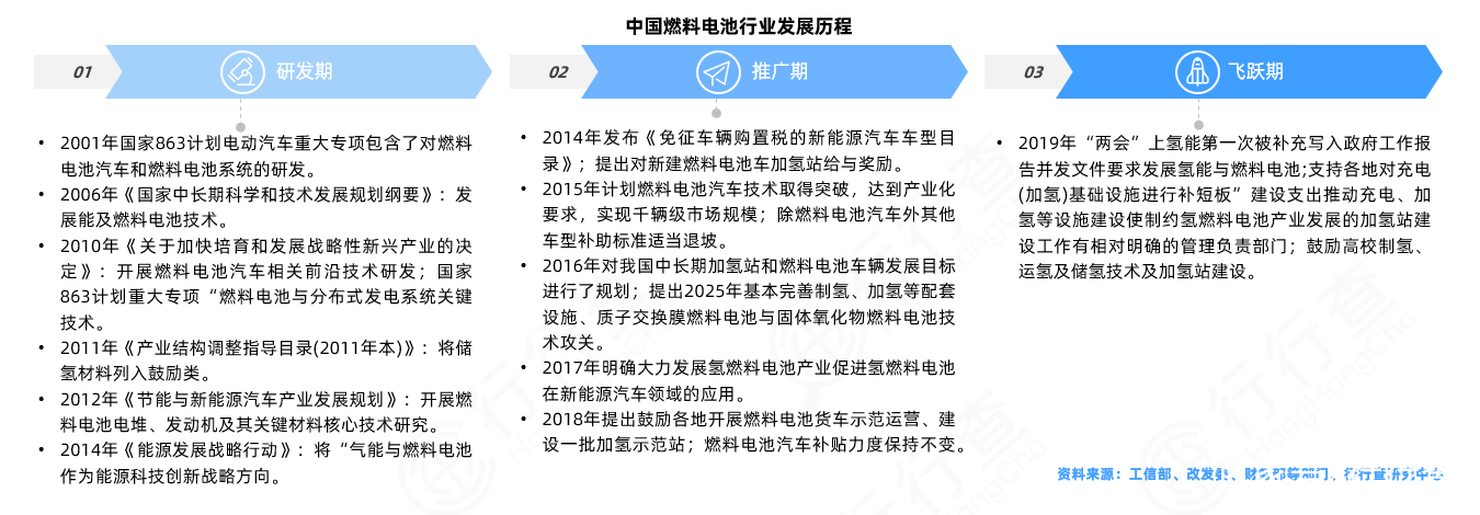 我國(guó)氫燃料電池起步較晚,2001年國(guó)家863計(jì)劃“電動(dòng)汽車”重大科技專項(xiàng)即已確立了以混合動(dòng)力汽車、純電動(dòng)汽車、燃料電池汽車為“三縱”,以多能源動(dòng)力總成控制系統(tǒng)、驅(qū)動(dòng)電機(jī)和動(dòng)力電池為“三橫”的電動(dòng)汽車“三縱三橫”研發(fā)布局,并持續(xù)全面組織啟動(dòng)大規(guī)模電動(dòng)汽車技術(shù)研發(fā),其中包含了對(duì)燃料電池汽車和燃料電池系統(tǒng)的研發(fā)。隨后國(guó)家相關(guān)部門出臺(tái)了一系列政策及研發(fā)計(jì)劃,促進(jìn)氫燃料電池的研發(fā)進(jìn)步,其內(nèi)容涵蓋了制氫、儲(chǔ)氫、燃料電池部件以及電堆與系統(tǒng),氫燃料電池車等一系列課題,促進(jìn)了整個(gè)產(chǎn)業(yè)鏈的發(fā)展與進(jìn)步。