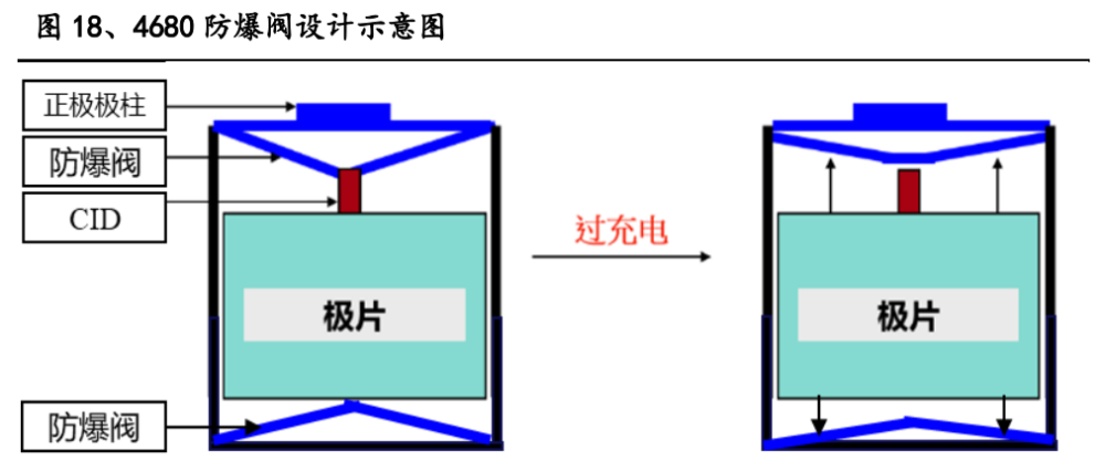 - 4680 底部和頂部分別設計防爆閥,正極集流盤與極柱直接焊接連接,且帶有 CID 設計,與 18650、2170 完全不同。