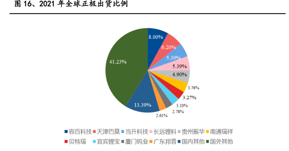 三元正極國產出貨加速,中高端車型拉動高鎳比例。2021 年,中國三元正極材料 出貨量達到 42.2 萬噸,同比增長 79.6%,占全球三元正極出貨量的 58.7%。在中 高端車型高能量密度需求的帶動下,高鎳三元占比由 2020 年的 22%提高至 2021 年的 36%,三元正極材料的高鎳化趨勢進一步明確。