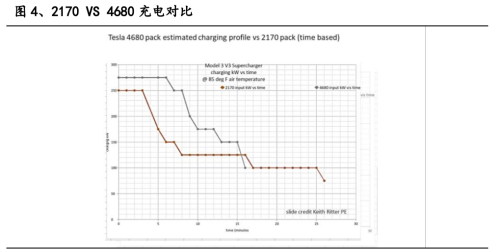 全極耳設計充電優勢明顯。一般而言,使用高性能導電劑石墨烯和降低壓實密度 等方法可提升電池最大充電電流,但會增加電池成本和能量密度。溫度是制約充 電的重要因素,4680 電池通過全極耳設計,縮短電子傳輸路徑、加寬傳輸通道, 全面導電,降低了熱量產生。4680 創新的全極耳設計能夠在不影響電池的能量密 度和成本情況下,大幅提高電池的倍率性能。