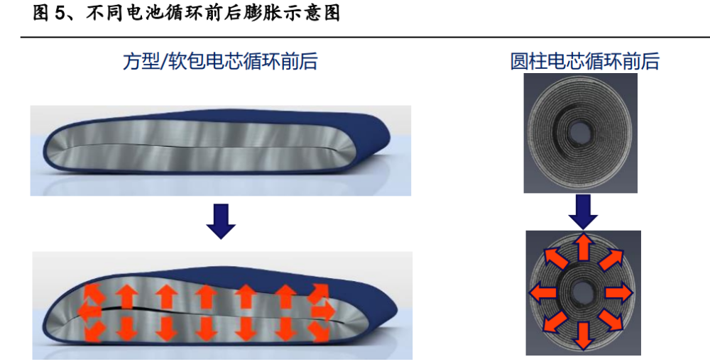 圓柱結構提高負極硅含量,提高電池能量密度。在負極中摻雜硅或氧化亞硅可顯 著提高電池容量,但硅在充放電過程中會產生巨大的體積變化(硅在充放電過程中 容易產生 300%的體積膨脹,而石墨只產生 10.6%的體積膨脹),從而引發 SEI 膜破 損副反應,導致電池容量衰減。4680 電池的不銹鋼殼體機械強度大,可充分吸收 負極的膨脹力;同時 4680 電池極片卷繞的特點可以使極片各個位置膨脹力均勻, 減少破損和褶皺的出現,而方型和軟包電池在 R 角處易出現應力集中而導致的破 損和褶皺。電池負極中硅的摻雜比例為 3%~10%,圓柱電池硅的摻雜比例相對高一 點。