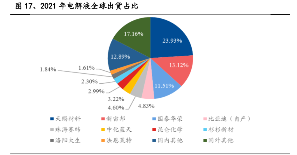 一體化布局,強化龍頭地位。新宙邦收購瀚康、蘇州巴斯夫增加添加劑產能,目 前新宙邦已建成 2000 噸 VC 產能和 800 噸 LiFSI 產能。天賜在新鋰鹽 LiFSI 研發 方面處于領先地位,同時六氟磷酸鋰自供比例達到 80%,因此天賜在六氟磷酸鋰 價格大幅提升的背景下,實現相關產品毛利率不降反升。目前天賜已建成 6300 噸 LiFSi 產能和 3.2 萬噸噸 LiPF6產能。預計天賜和新宙邦憑借技術優勢和成本 優勢進一步擴大全球電解液出貨占比,預計 2022 年天賜和新宙邦分別達到全球電 解液出貨的 25%和 15%。