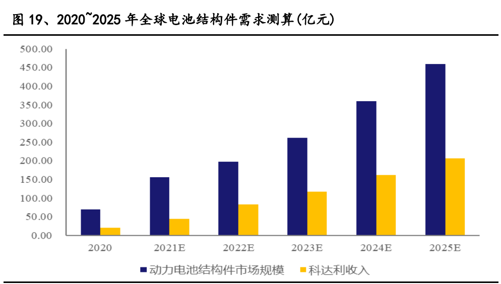 隨著 4680 電池滲透率提升,科達利將充分受益。預計 2022 年 4680 電池結構件給 科達利帶來 3.4 億元訂單,占公司收入的 4%,預計 2023 年 4680 結構件業務給科 達利帶來 14 億元訂單,占公司總收入 11.87%。