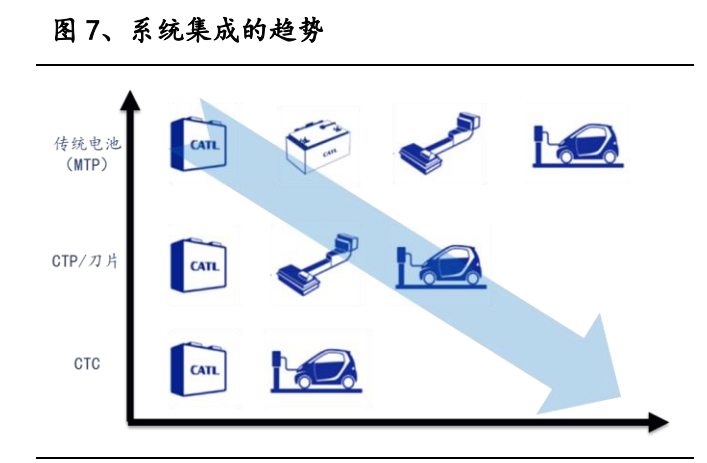 CTC 是未來電池整車匹配的必然趨勢。從特斯拉 Model S 的小模組,到 Model 3 的大模組,再到 4680 推出的 CTC 方案,模組的概念逐漸弱化和取消,電池包的集 成效率不斷提高。特斯拉電池系統不斷迭代,電池 BOM 成本降低,電池系統生產 效率和電池的體積利用率提高,成為降低電池成本和提高能量密度的有效路徑。 國外車企電池系統集成向 CTC 和 CTP 傾斜,特斯拉將在下一代 Model Y 使用 CTC, 現代汽車旗下的摩比斯與寧德時代簽訂了 CTP 的深度合作協議,沃爾沃將在第三 代電池系統集成方案采用 CTC。