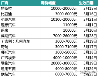 3月以來,特斯拉、比亞迪、小鵬汽車、理想汽車等多家車企調高售價。